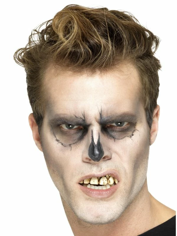 - Rotten skeleton teeth with brown dirt marks between the teeth, pale gums and includes fitting beads for custom fit to secure to teeth.
