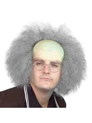 A balding old man wig. Grey frizzy old hair attached to a plastic bald cap. You will age in minutes of putting on this wig. Perfect for Einstein Character. Colour Grey