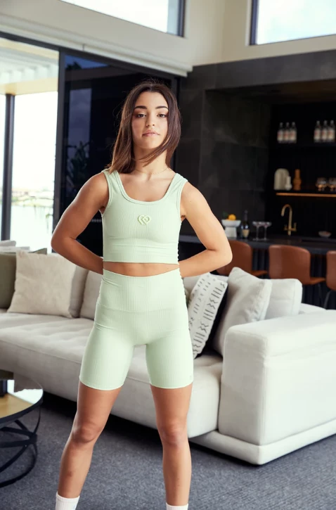 Lydiaย wears a size Adults XS Sage Ribbed Crop.