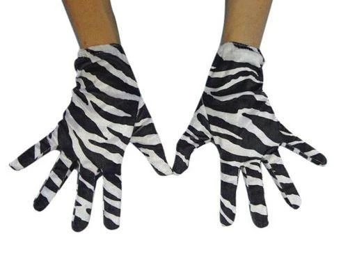 Short black and white striped zebra animal print gloves. Make a fun and unusual flair to your next fancy dress costume.
