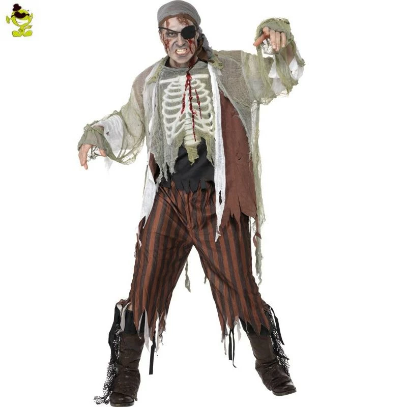 Bring the scary to your annual Halloween costume party with ourย Zombie Pirate, featuring a skeleton bone printed pirate top, head scarf, eye patch, brown pants and boot covers.ย