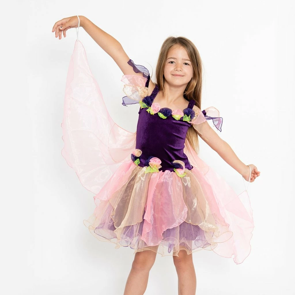 This plush deluxe dress is in a divine velvet fabric with oodles of organza in the skirt and wings. Dotted with pretty handmade flowers and petals. The wings are long enough hold and catch the wind for that imaginative flying experience, a wonderful style that is comfortable and beautiful.