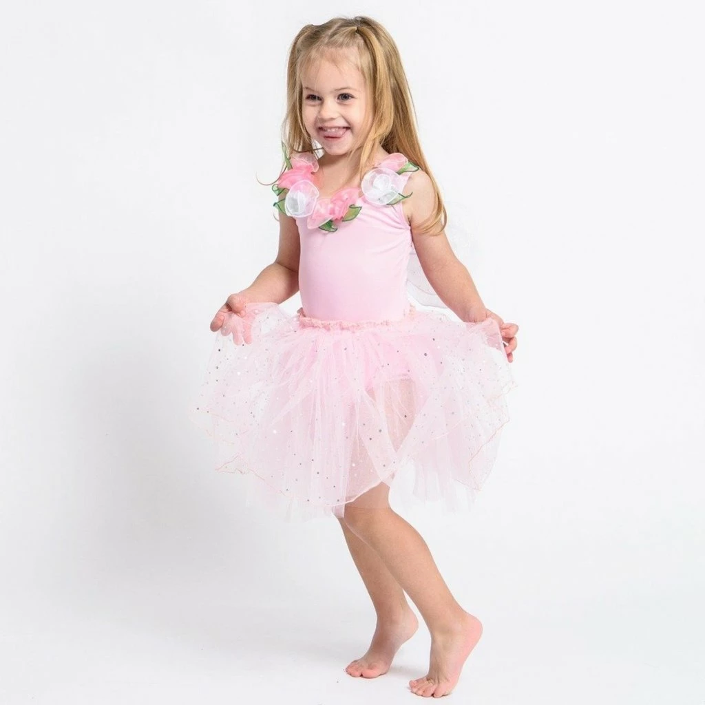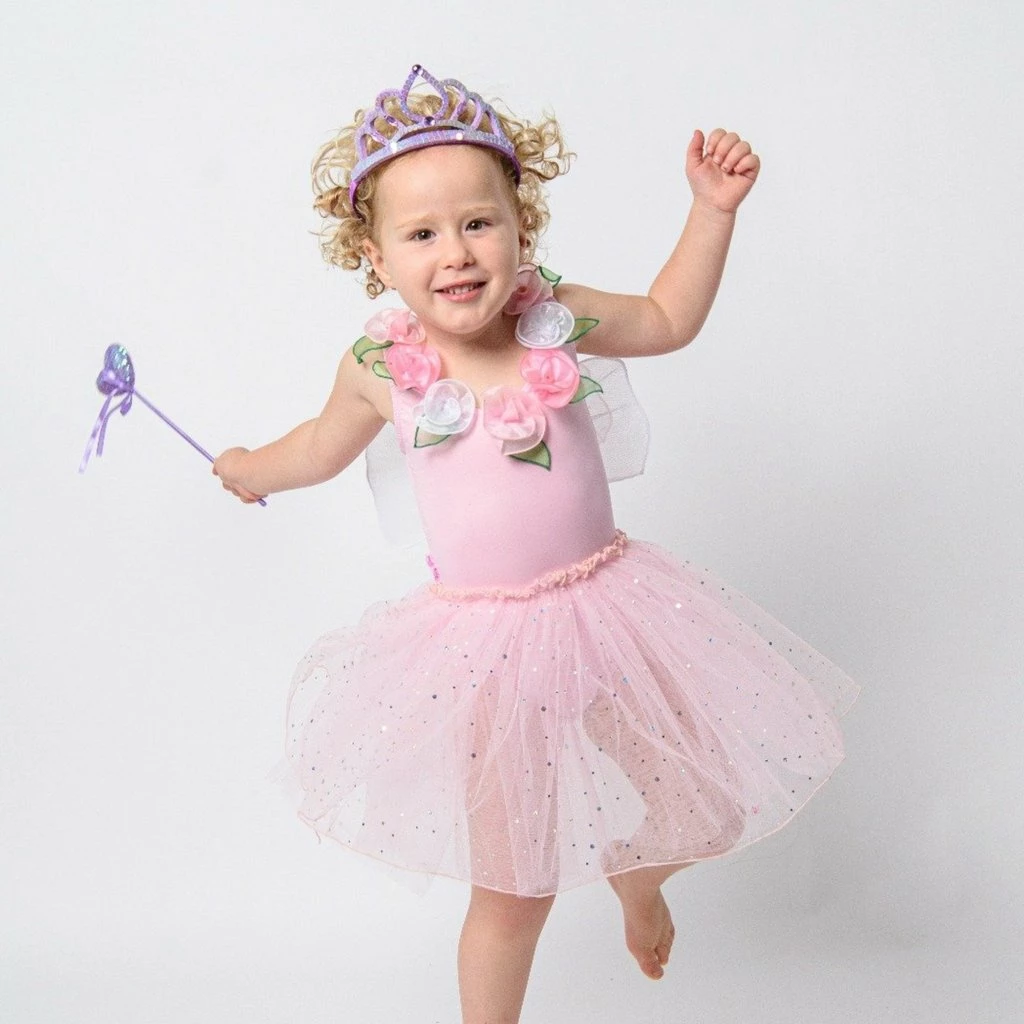 A very beautiful tutu-style dress made using our lovely spot glitter fabric. Featuring a comfortable fitting bodice dotted with handmade flowers. The skirt twinkles and there is even a pretty set of soft wings on the back. Plenty of twirling fun to be had in this gorgeous dress.