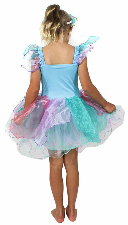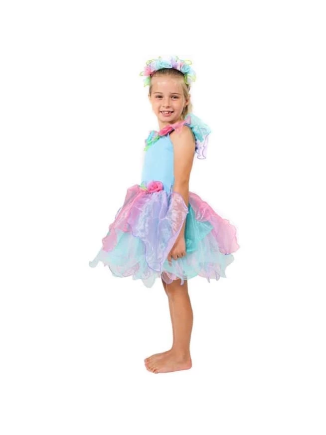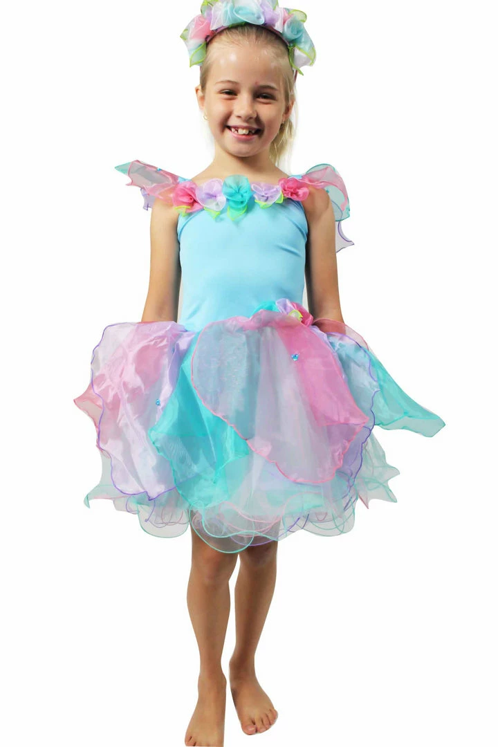 Your little one will be ready for Book Week with our Wish Fairy Dress. Featuring a light blue girls dress with a blue bodice styled with an assortment of colourful flowers around theย neckline and the waist. The attached blue tutu is overlayed with an assortment of large lavender, blue and pink petals, made from thin tule material. Great for your daughter’s book week costume!
