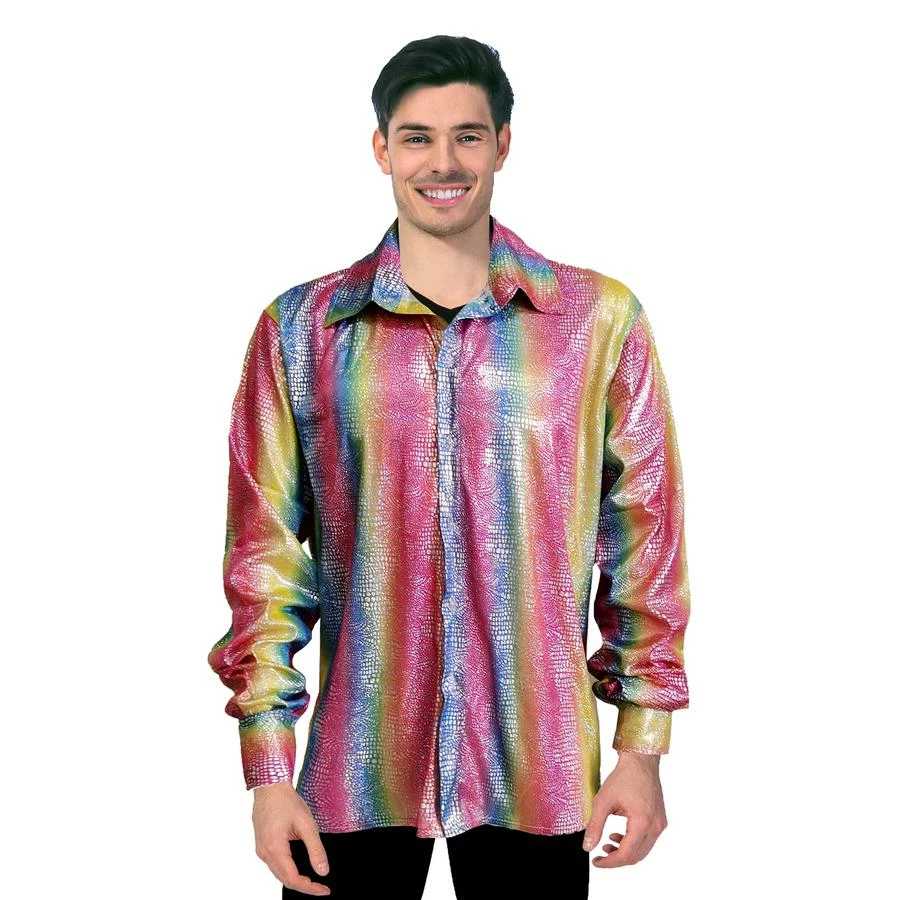Get down and boogie in this Adult Disco Shirt in Rainbow! Perfect for a 1970s party with big disco vibes!