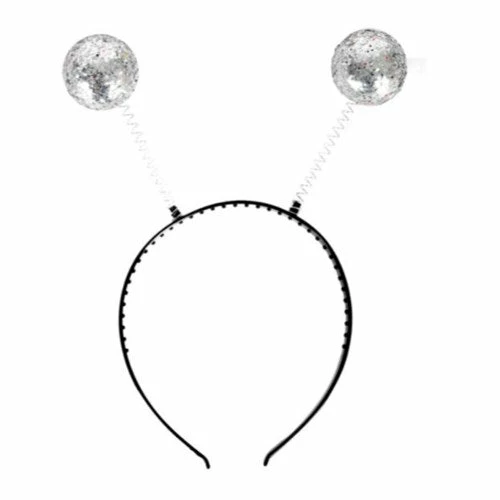 Silver spiral wire with glitter balls attached to a plastic headband. Perfect for your favorite martian, alien or disco