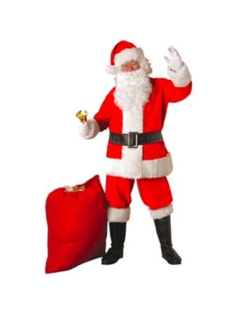 Deluxe Santa Suit for Christmas Day! Includes: Jacket, Pants, Vinyl Belt, Hat, & Gloves Size: Jacket: 61 inches/155cm ~ Pants: 52 inches/132cm POLY/COTTON