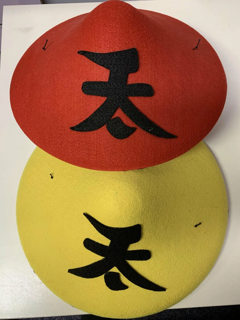 Chinese Hat – Coolie hat, Asian hat, Rice hat. Felt Fabric Hat in red or yellow with asian symbol.