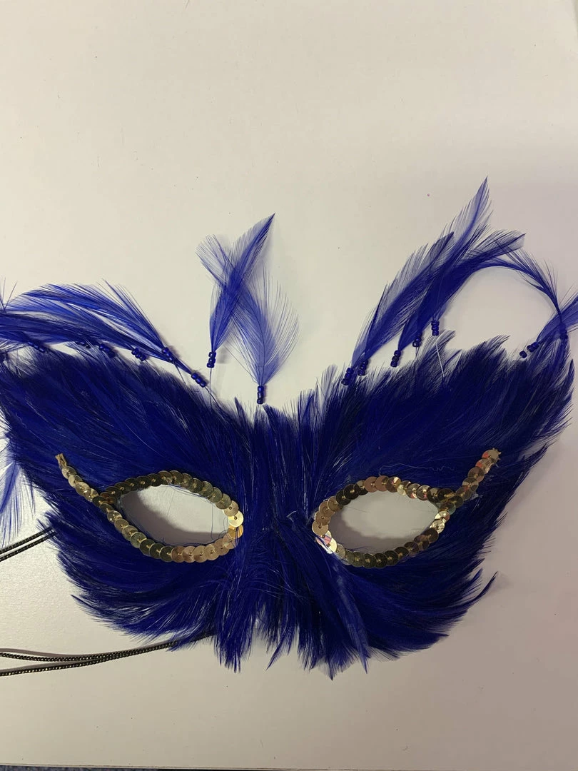 Blue feather mask with gold sequin around eyes