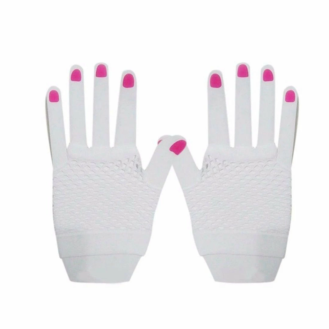 Funky white women’sย 80’s costumeย gloves. This women’s 1980’s costume accessory is perfect to add some colour to your sexy 1980’s themed fancy dress costume!