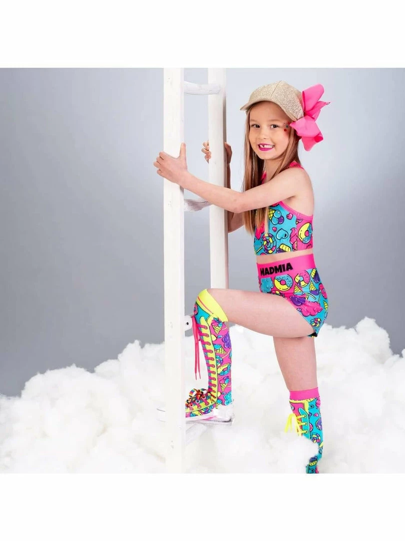 MADMIA Candy Land socks are a mix and match pair in blue and pink, with the perfect mix of ice-cream, doughnuts, lolly-pops and candy hearts to make you extra sweet. Complete with a shoelace print and shoe lace topper in pink and yellow.