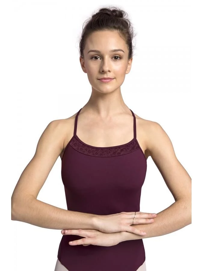L59557 VINTILLY Floral jacquard mesh cross back, front yoke camisole leotard FABRIC Main – 90% Nylon, 10% Spandex Matte Contrast – 86% Nylon, 14% Spandex Floral Jacquard Mesh