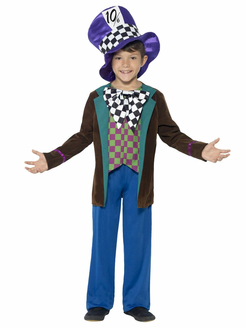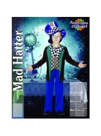 Mad Hatter Costume comes complete with the wacky jacket with attached checked waistcoat and oversized bow tie along with the blue elasticated trousers. The Mad Hatter Costume is completed with the purple top hat with black and white check band.ย ย
