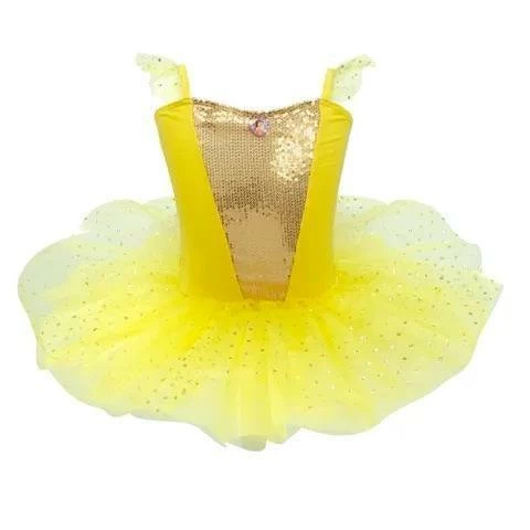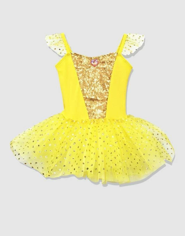 Play pretend and sparkle like Princess Belle. This sparkly tutu features a comfortable stretch jersey bodice with a sparkling sequin central panel. The tutu has an integrated leotard pants with a multi-layered tulle skirt. The skirt top layer shimmers with light-reflecting glitter spots as do the glitter organza shoulder strap ruffles.