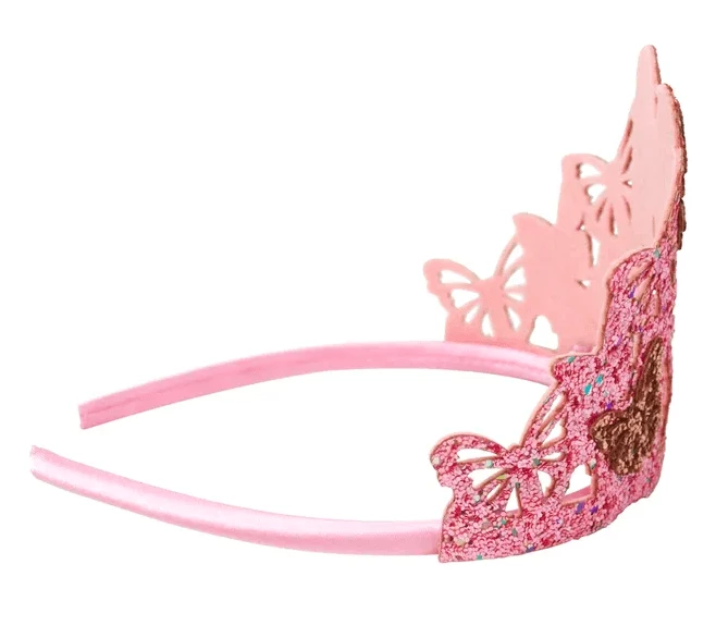 Encourage imagination and play and let her be queen of the butterflies with this Butterfly Glitter Crown. This high shine pink & gold glittery crown is laser cut into a beautiful butterfly design and fixed to a comfortable alice band. The soft design means it is comfortable to wear all day and safe for high energy play time! * High shine chunky glitter * Laser cut design * Soft style safe for high energy play time * Suitable for Ages 3+
