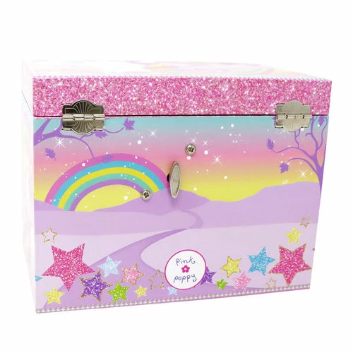 This classic musical jewellery box is a gorgeous keepsake portraying fun illustrations of a fantasy land full of kitticorns and rainbows.The wind up design plays the classic tune ‘In the good old summer time’ whilst the Kitticorn figurine twirls delightfully. It features an oval mirror and flocked interior. It also includes 4 drawers for additional storage and internal ring organiser.