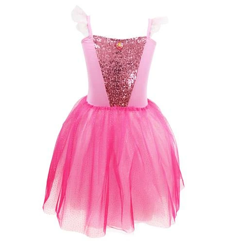 Disney Princess Aurora Romantic Tutu Dress Inspired from ©Disney Princess. This Rapunzel tutu dress with a long style skirt is suitable for all occasions. The ombre coloured mesh with sparkling glitter flows over a layer of stiff tulle for volume and silky satin lining soft against her legs. The comfortable stretch jersey bodice has a sparkling sequin central panel and character printed heart gemstone. Integrated leotard pants make climbing and handstands all still possible in this everyday dress. The shoulder ruffles shimmer with glitter on adjustable shoulder straps making the fit perfect.