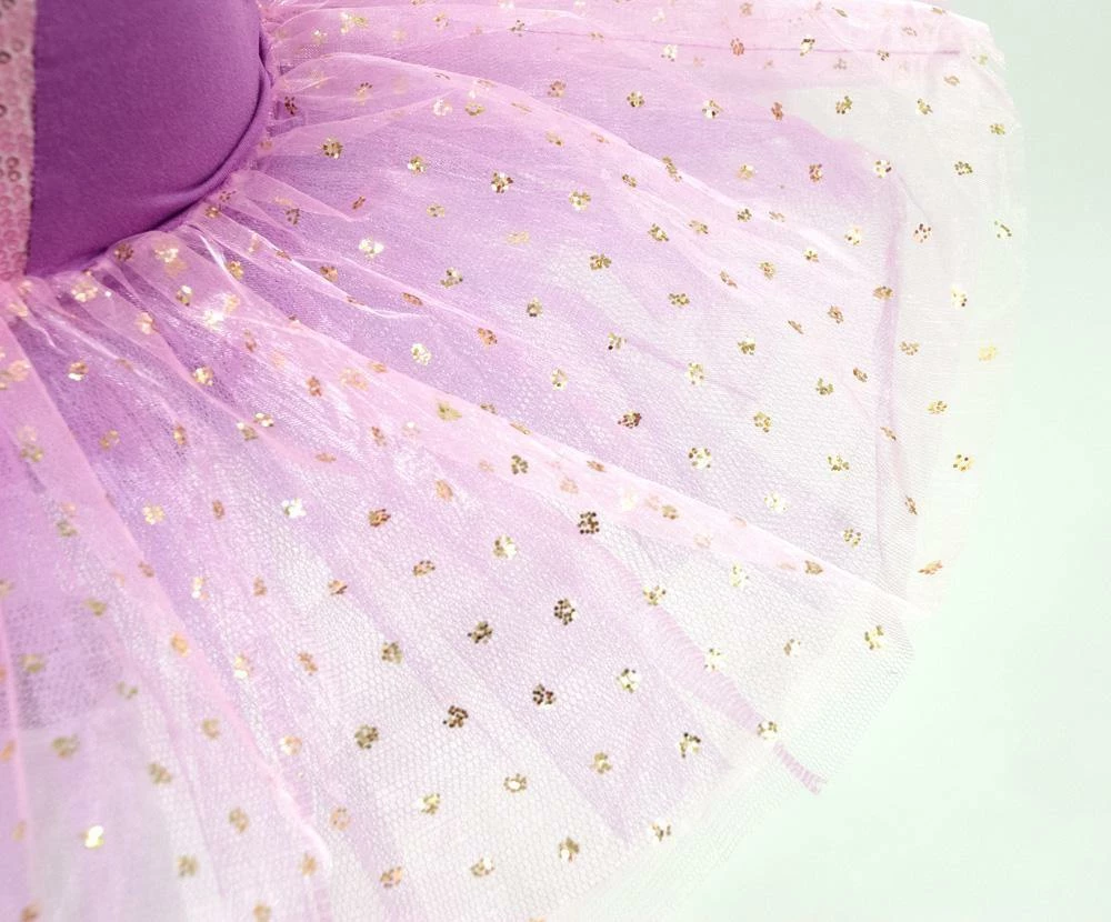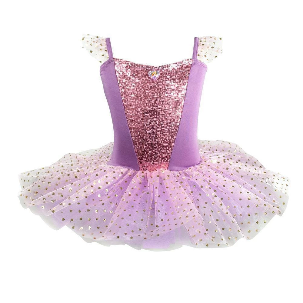 Disney Princess Rapunzel Tutu/Dress with Multi-layered tulle skirt Inspired by Disney Princess. Play pretend and sparkle like Princess Rapunzel. This sparkly tutu features a comfortable stretch jersey bodice with a sparkling sequin central panel. The tutu has an integrated leotard pant with a multi-layered tulle skirt. The skirt top layer shimmers with light-reflecting glitter spots as do the glitter organza shoulder strap ruffles. Features adjustable shoulder straps, integrated leotard pants and a multi-layered tulle skirt.