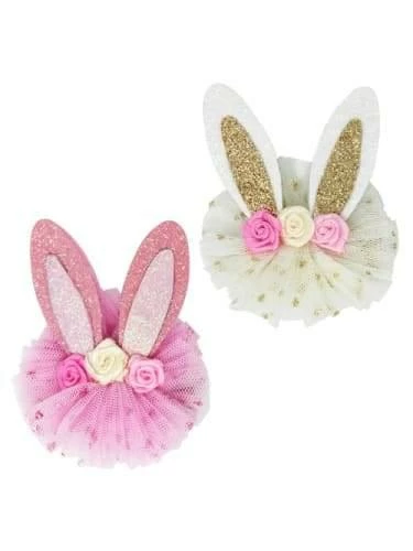 Floral bunny hairclips in a tub featuring glittered ears – Multi coloured silk flowers and tulle adorn these gorgeous bunny inspired hair clips Three rose look silk flowers – Gathered glittery tulle tuft. 1 per pack. colour selected at random, depending on availability.