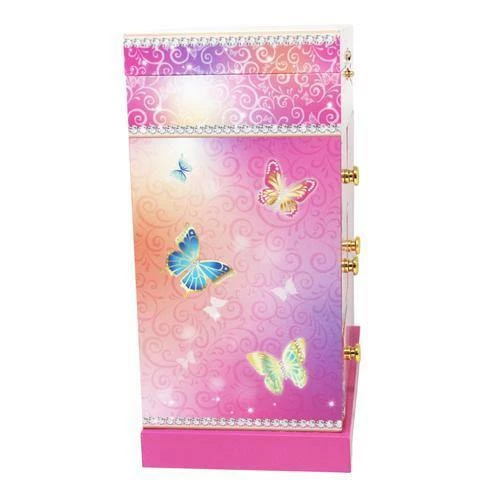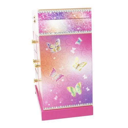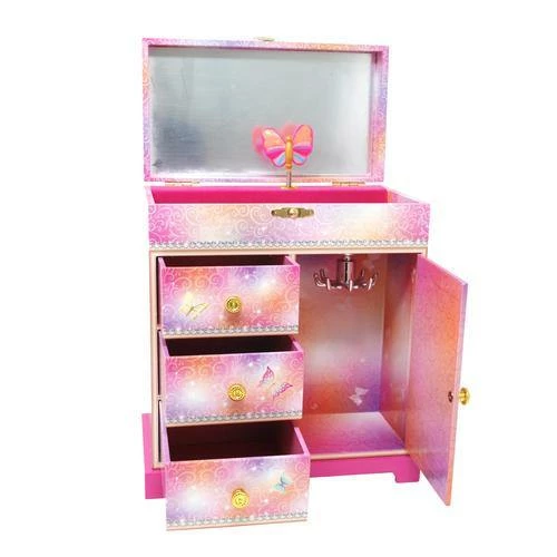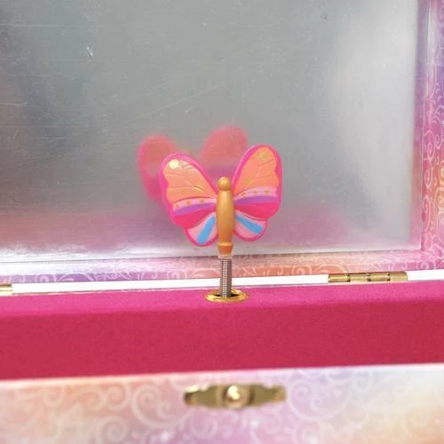 This large Deluxe Butterfly themed music box is a practical gift with plenty of room to store her whole jewellery collection. It features large top compartment with flocked lining to protect precious metals, three drawers for separating trinkets and a rotating hook chandelier for hanging multiple bracelets & small necklaces. Wind up for the inner butterfly to rotate to the tune Dance of the Sugar Plum Fairy. It also contains a full size mirror.