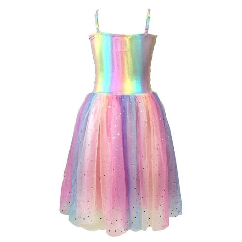 Pastel Rainbow Party Dress Add a splash of colour to her wardrobe with Pink Poppy’s Pastel Rainbow party dress. The Rainbow shimmery bodice has an overlay of gathered pink mesh with sparkling holographic sequins. The skirt is a beautiful rainbow gradient reflecting little silver stars and moons with an elasticated waistband and satin lining. A magical piece featuring adjustable shoulder straps for the perfect fit.