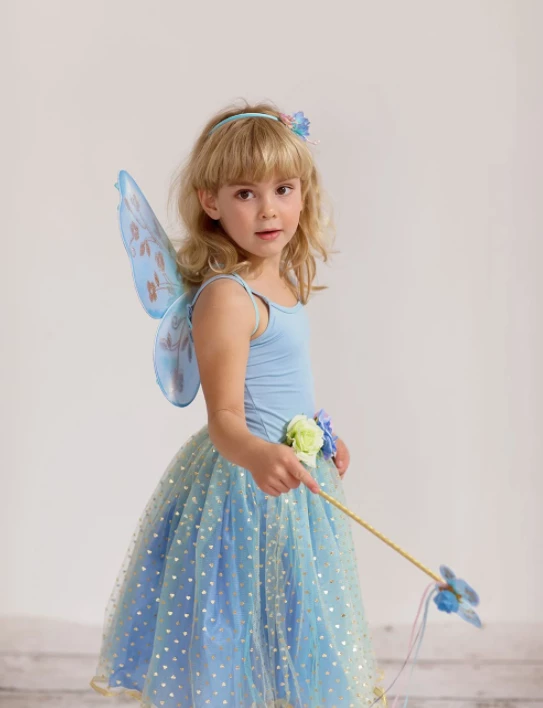 The enchanting into the woods toddler fairy dress features a knit bodice in blue adorned at the waist with multi coloured flowers and a blue satin lined tulle skirt with gold foil heart print.ย Blue Fairy Dress – Into the Woods | Pink Poppy