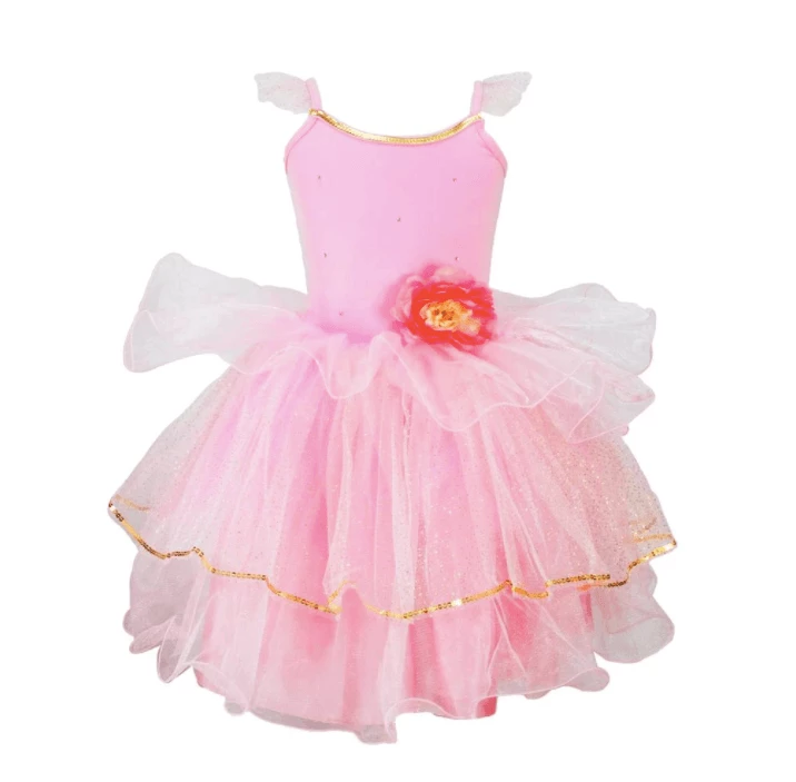 Peony flower fairy dress is just magical. Featuring a pink bodice with gold sequins trim and tulle shoulder detail a fabric peony at the waist and a dramatic skirt which has layers of pink and metallic ruffles finished with gold sequins.
