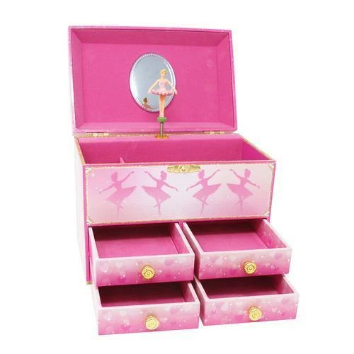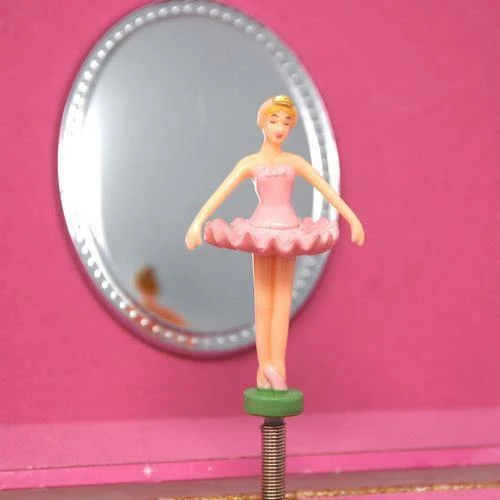 This classic musical jewellery box is a gorgeous keepsake for ballet enthusiasts covered in beautiful Ballerina silhouettes. The wind up design plays the classic tune ‘Swan Lake’ whilst the Ballerina figurine twirls delightfully. It features an oval mirror and flocked interior.