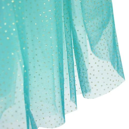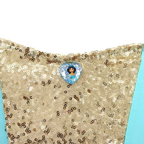 Disney Princess Jasmine Romantic Tutu Dress Inspired from ©Disney Princess. This Jasmine tutu dress with a long style skirt is suitable for all occasions. The ombre coloured mesh with sparkling glitter flows over a layer of stiff tulle for volume and silky satin lining soft against her legs. The comfortable stretch jersey bodice has a sparkling sequin central panel and character printed heart gemstone. Integrated leotard pants make climbing and handstands all still possible in this everyday dress. The shoulder ruffles shimmer with glitter on adjustable shoulder straps making the fit perfect.