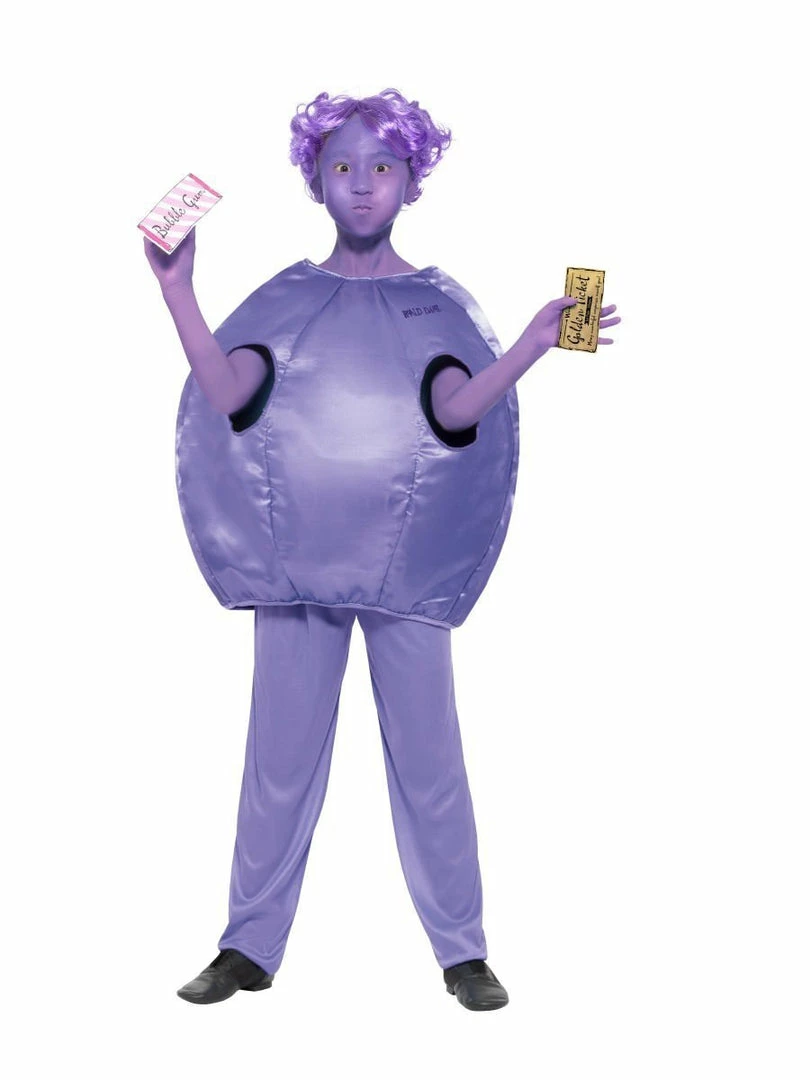 Your Child will look like they’ve just eaten an everlasting gobstopper when they wear the wonderful Violet Beauregarde Costume from our officially licensed Roald Dahl Costume collection. This One size childrens costume is Brilliant for any Willy Wonka Theme Costume for World Book Day, this fantastic fancy dress costume comes complete with a Padded Purple Top, Purple Trousers. Also included is a Golden Ticket and a Bubble Gum prop.
