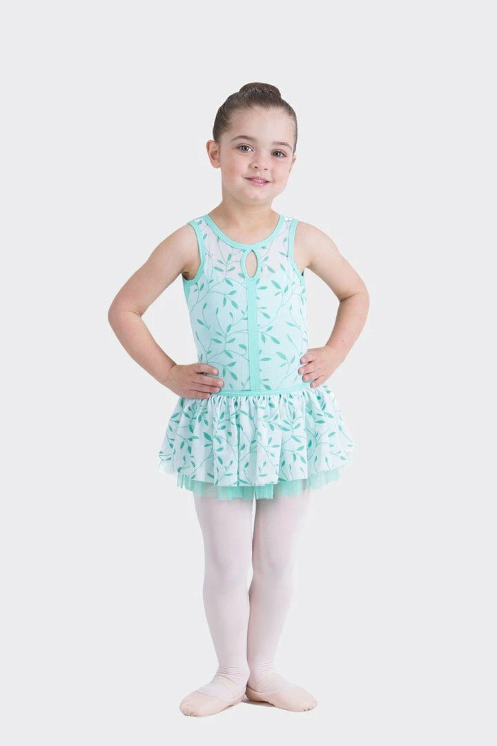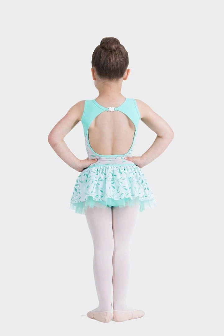 TACTEL, lined. Cap sleeve leotard with open crossover back. Leaf pattern print on light mesh.
