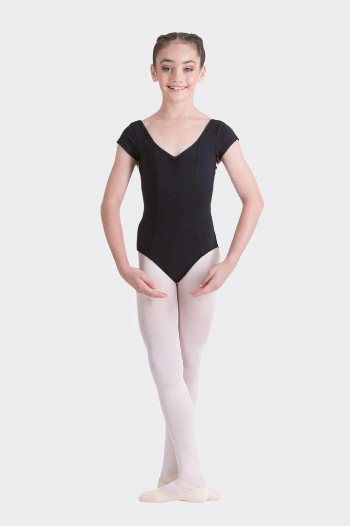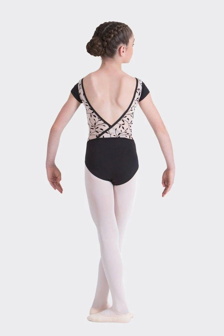 TACTEL, lined. Cap sleeve leotard with open crossover back. Leaf pattern print on light mesh.