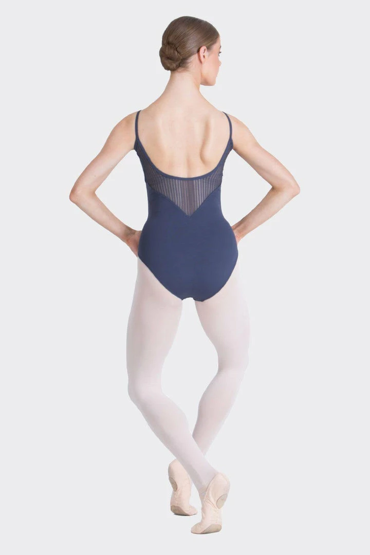 TACTEL, lined. Camisole strap leotard with v-shape mesh scooped back.