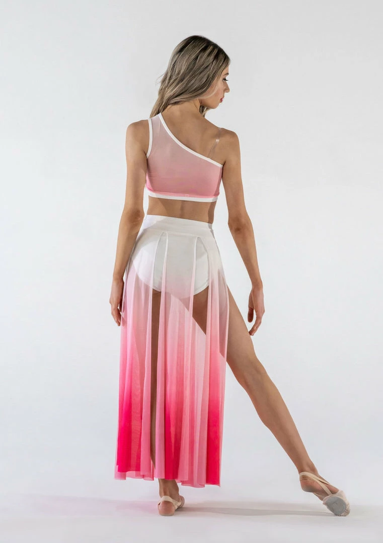 This beautiful ombre 2 piece set features a stunning draped panel skirt and one shoulder crop design. the perfect costume to compliment your lyrical or contemporary performance