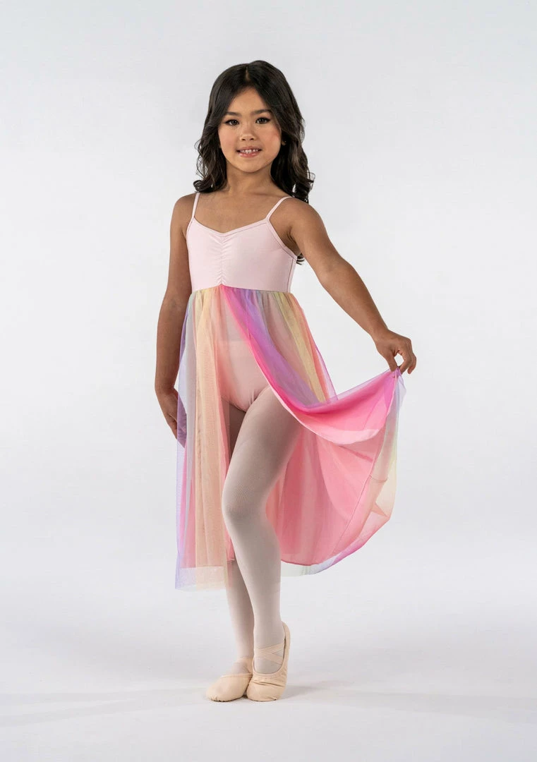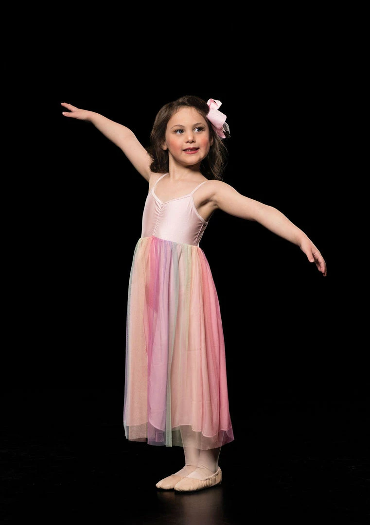 The rainbow lyrical dress features a radiant rainbow overlay over a pink chiffon skirt. Split down the centre for extra movement. perfect for any little dancer.