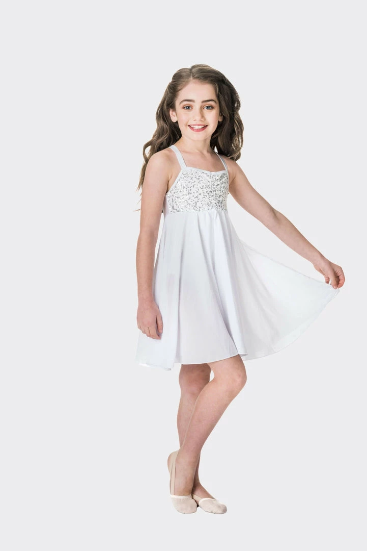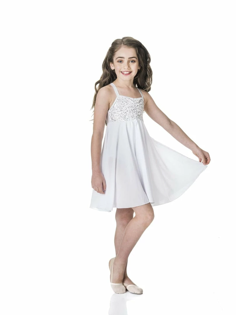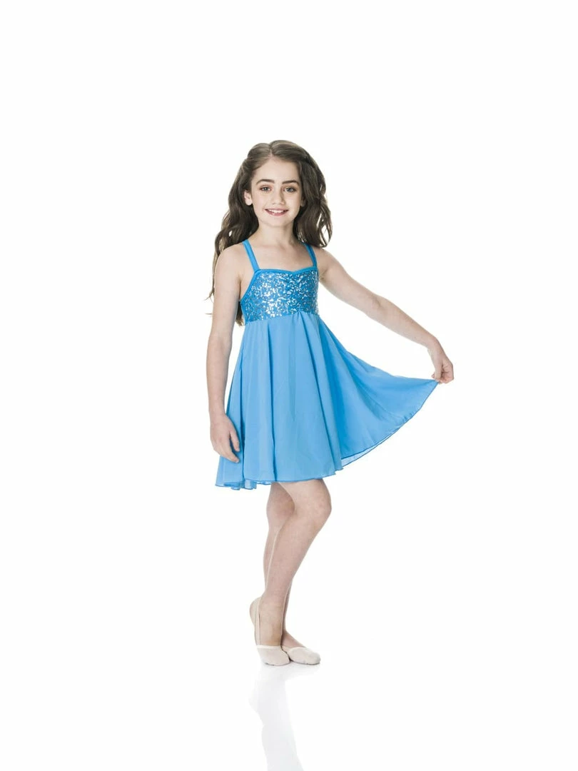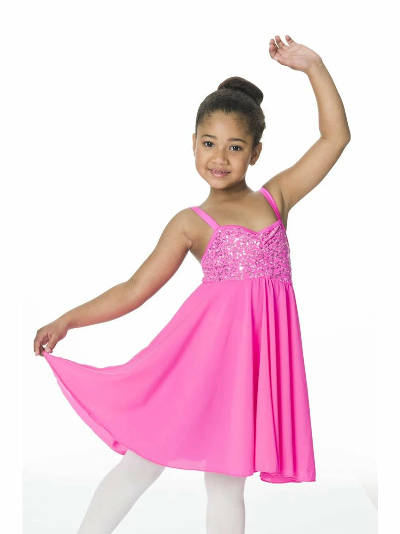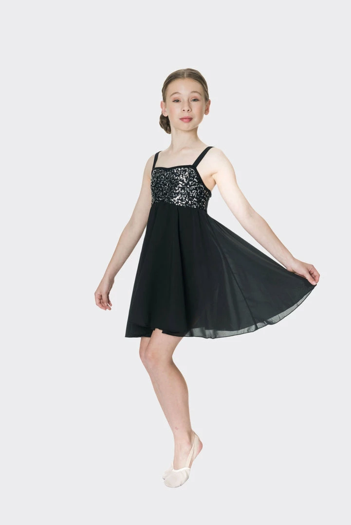 Sequin Contemporary,ย Lyrical Dress, with a gathered front style sequin top. chiffon dress, making the perfect last minute costume.