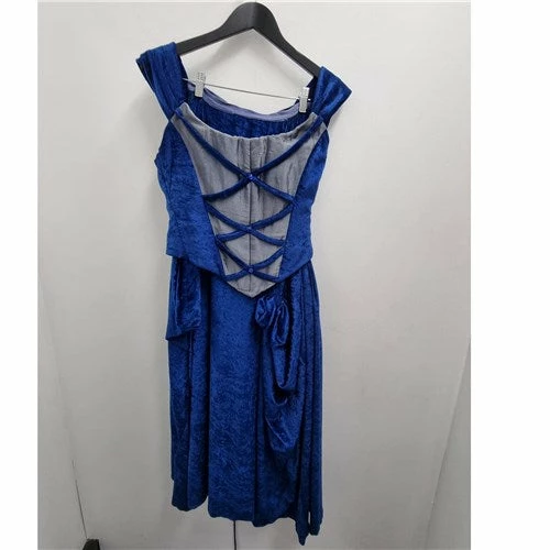 Ex-Hire Costume: Blue and Silver 2pce corset and skirt. Blue crushed velvet skirt with hook and eye waistband. Corset bodice with boning and lace up back. Suitable for 1700s- 1800s, Marie Antoinette.