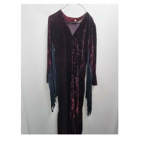 Ex-Hire Costume: Burgundy Crush Velvet Dress with black strips hanging from sleeves. Size 8-10