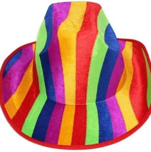 Get into the party spirit with this rainbow stripe velvety cowboy hat. Makes a fabulous costume accessory for a Rainbow themed party, Mardi Gras parade or Pride March.