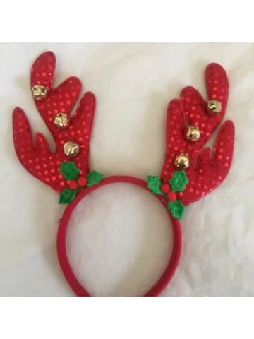 This Reindeer Antlers Headband has a pair of red sequined antlers with green faux holly leaves and gold jingle bells that come on a matching red headband.