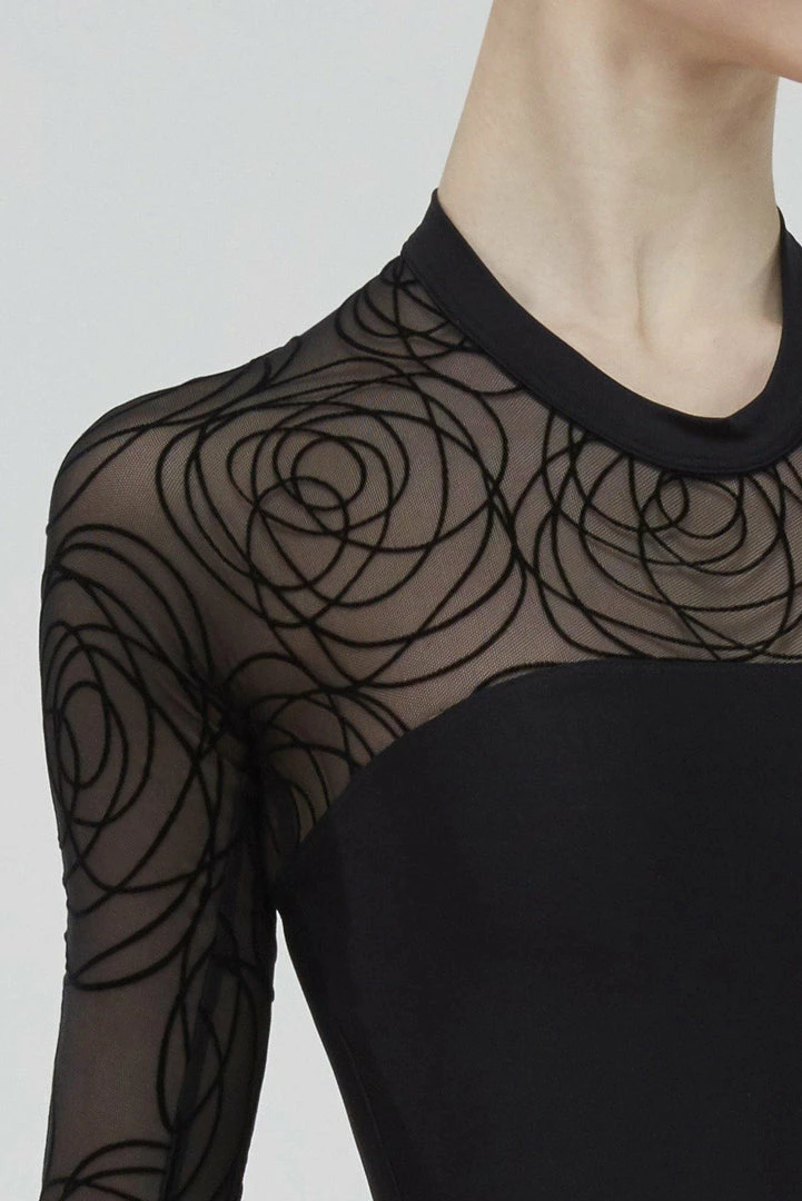Meringue, an elegant yet sophisticated style leotard. A perfect high neck long-sleeve camisole leotard with a back opening, for a more luxurious feel. Featuring beautiful flocked velour tulle and two-button closure. Chest lining.